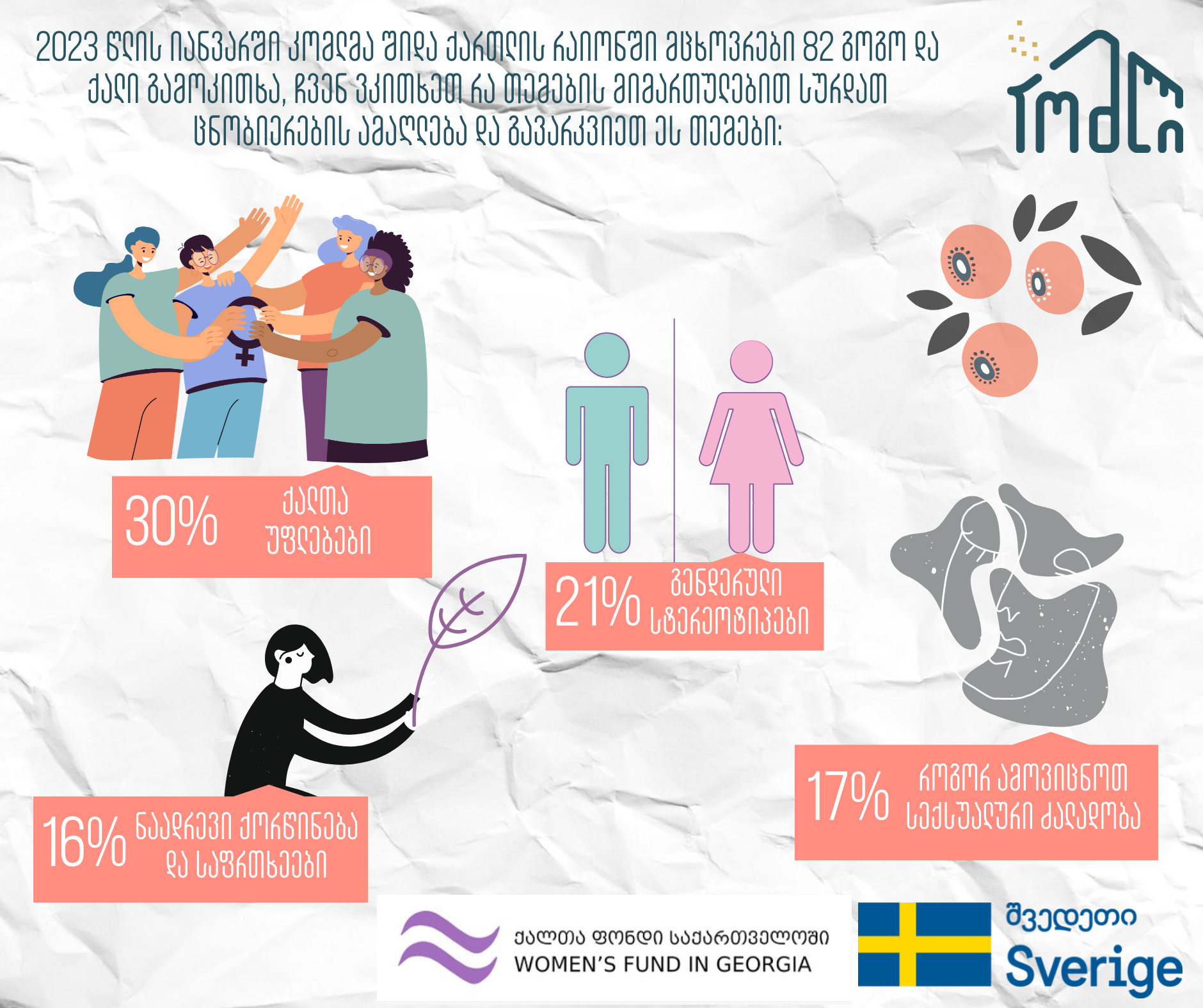 კომლი, ქალთა ფონდის ფინანსური მხარდაჭერით, ახორციელებს პროექტს "უსაფრთხო თანაშექმნის სივრცეები - განათლებისა და განვითარებისთვის", რომლის მიზანია: კასპის მუნიციპალიტეტში ქალებმა და გოგოებმა კვალიფიციური გინეკოლოგიური და ფსიქოსოციალური კონსულტაციები გაიარონ, ცნობიერება აიმაღლონ სექსუალურ განათლებასა და უფლებებზე, ისევე როგორც [...]
